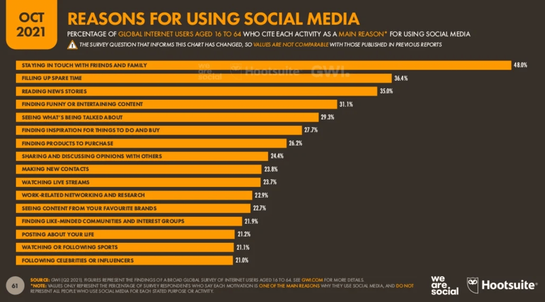 Even as an average across all global internet users aged 16–64, “finding inspiration for things to do and buy” and “finding products to purchase” come pretty high up the list of main reasons to use social media – as the chart below shows.