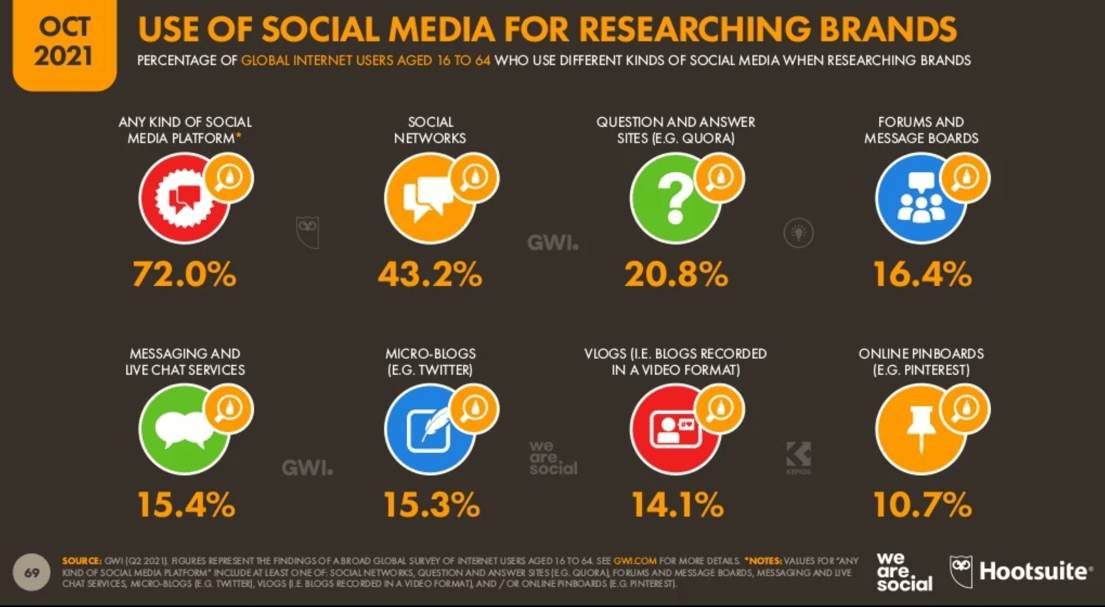 Meanwhile, 72 per cent of all global internet users aged 16–64 use social media to research brands.