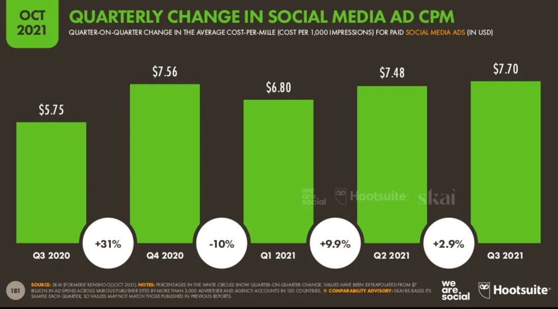 So, you’ve now realized you have to put some money behind your gym’s Facebook ads. The first challenge is that the average Cost Per Impression has been rising over the past year, up 34 per cent between October 2020 and October 2021. (In the below slide, note that CPM cost is per 1,000 impressions.)