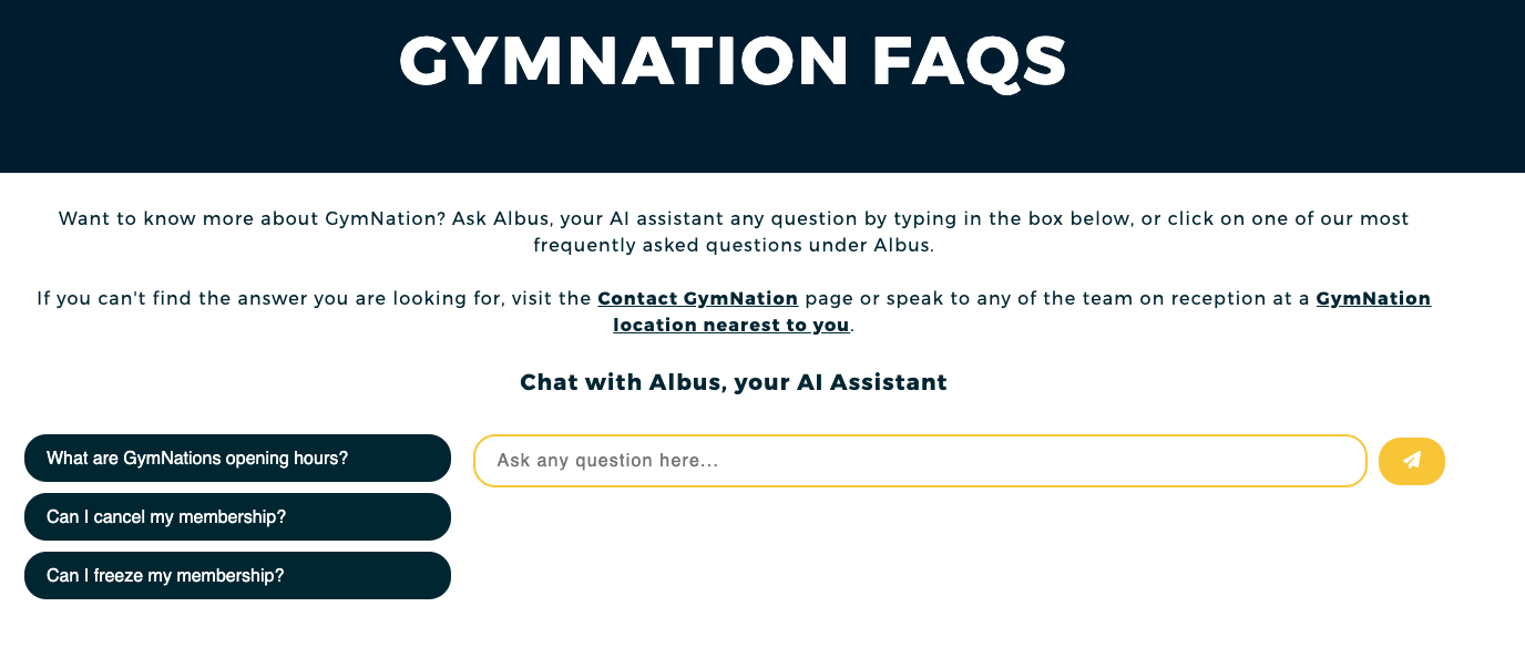 Keepme CEO, Ian, is a member of the Board for UAE Operator Gymnation, who are undoubtedly leading the way in automating their customer service. They have an AI Assistant named âAlbusâ to assist with enquiries on their site.Â
